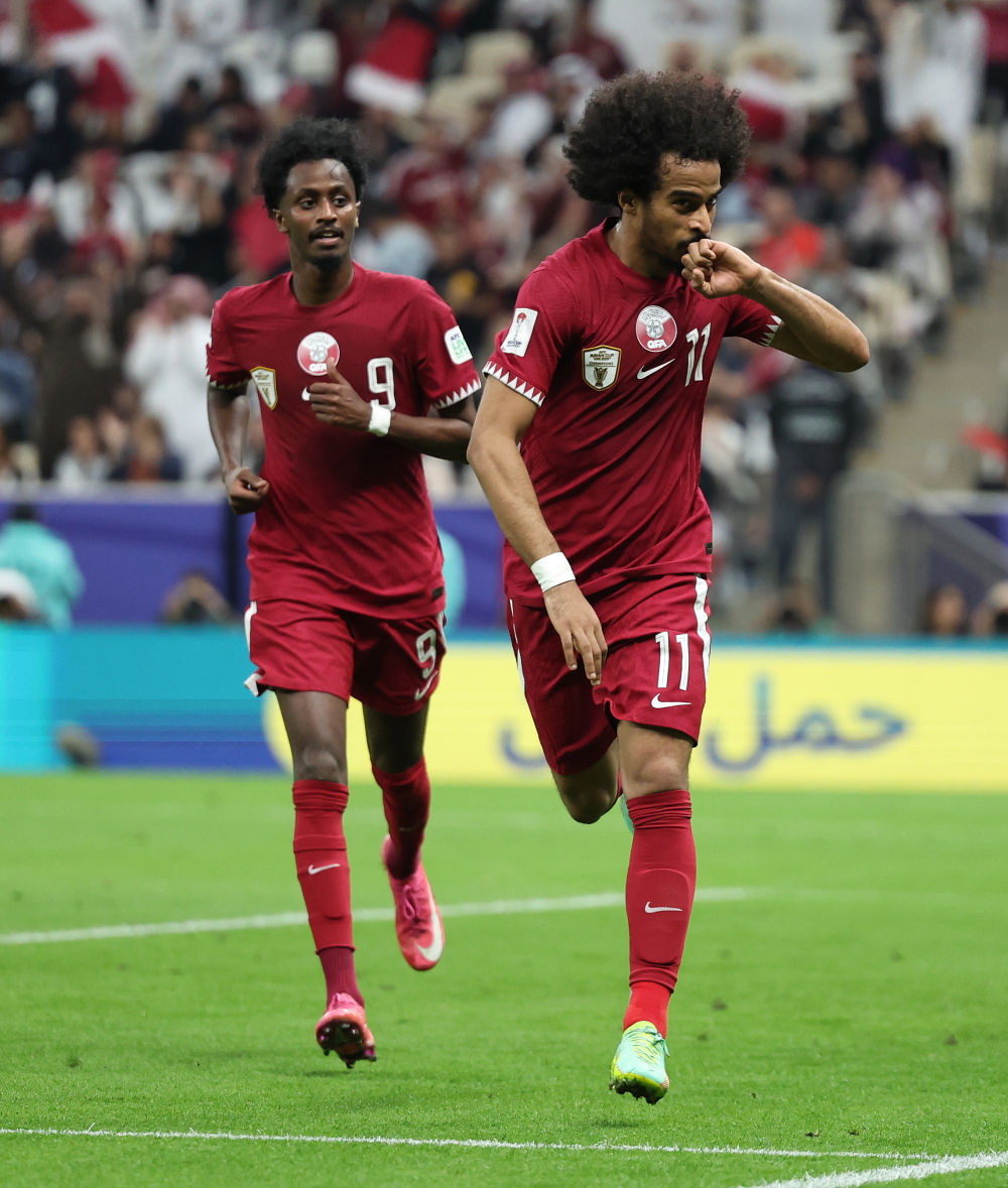 1月12日,卡塔爾隊球員阿克拉姆·阿菲夫(右)在比賽中慶祝攻入本屆亞洲杯首粒進球。新華社記者 賈浩成 攝
