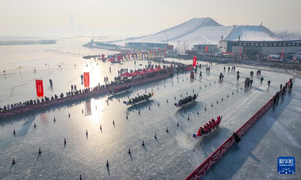 1月13日,市民參加冰上龍舟比賽(無人機照片)。新華社記者 馮開華 攝