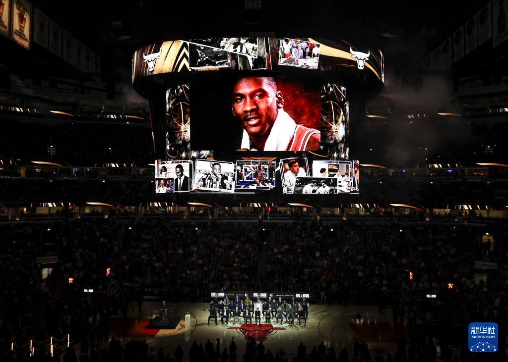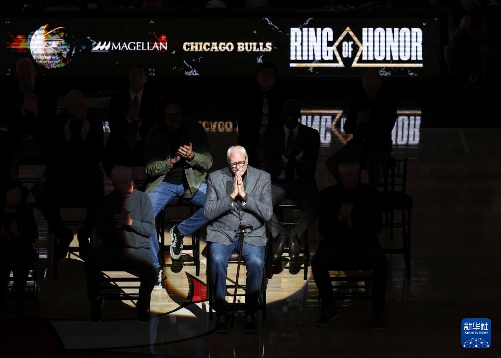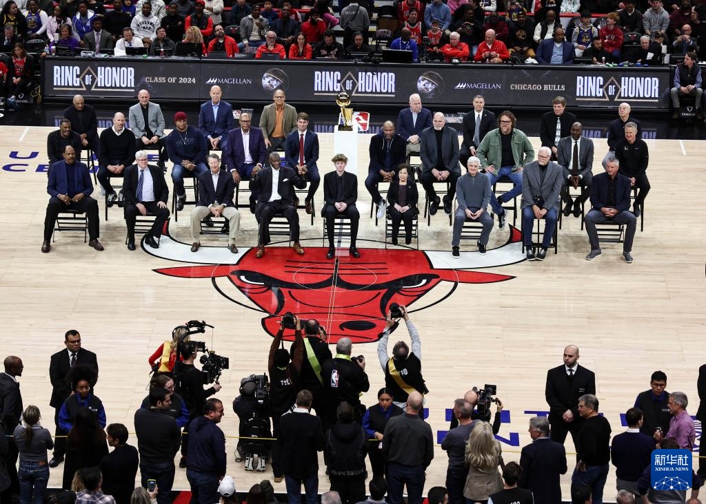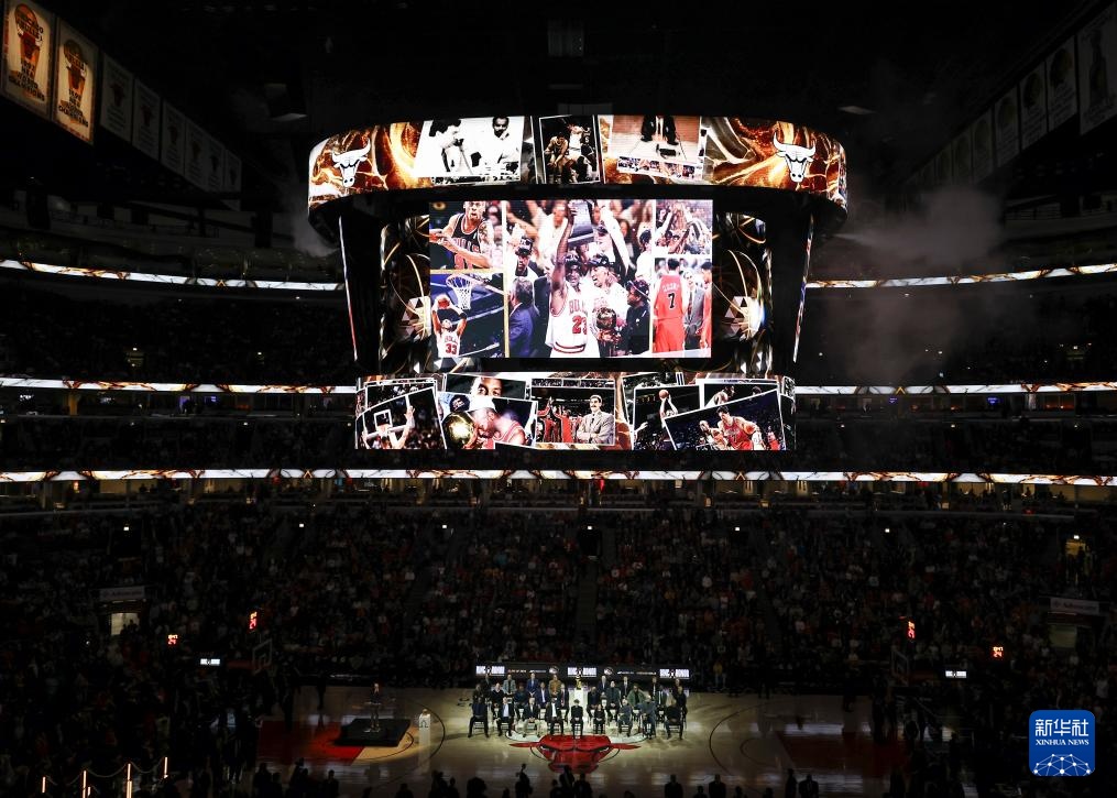 1月12日,芝加哥公牛隊在中場休息時舉辦榮譽戒指頒發儀式。新華社發(喬爾·萊納攝)