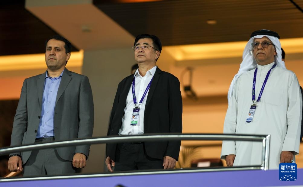 1月13日,中國足協主席宋凱(中)在比賽前。新華社記者 賈浩成 攝