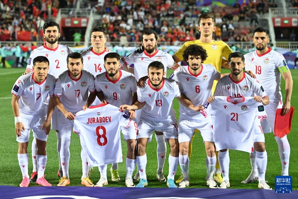 1月13日,塔吉克斯坦隊首發球員在賽前合影。新華社記者 江漢 攝