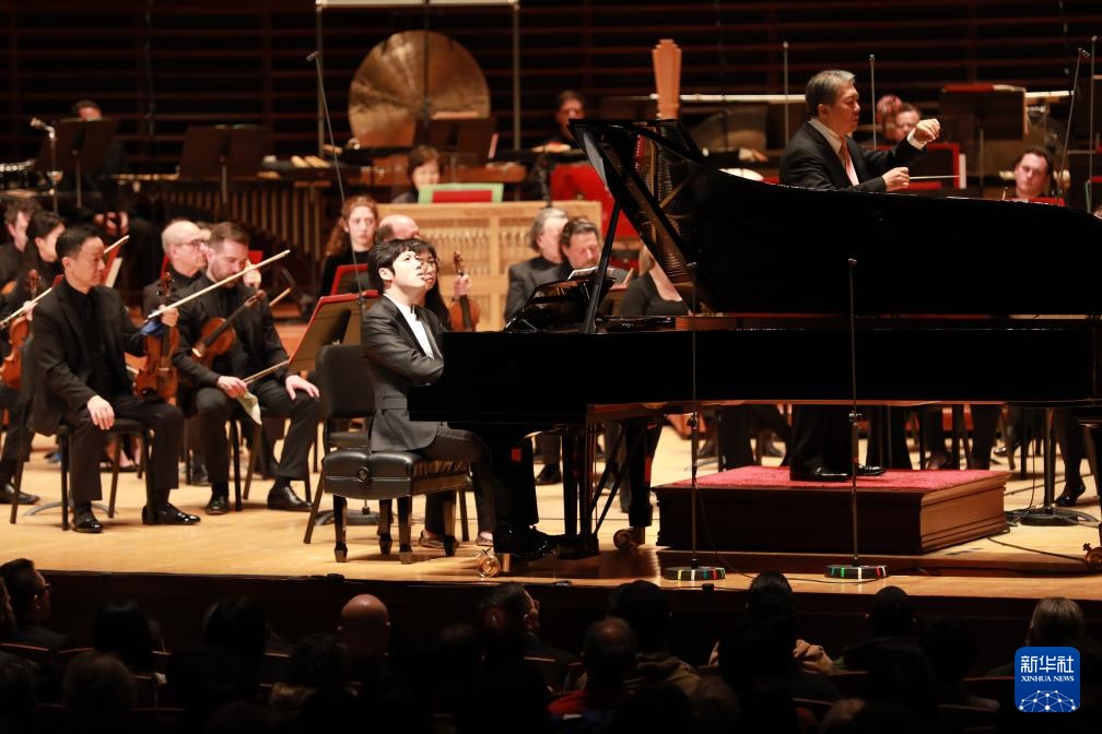 1月12日,在美國費城,中國鋼琴家張昊辰(中)在2024年費城交響樂團新春音樂會上演出。