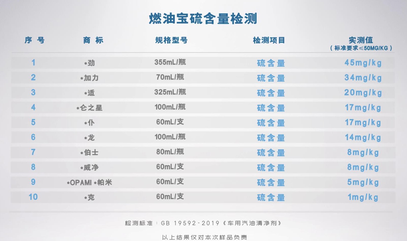 通過檢測結果,我們發(fā)現(xiàn)10款燃油寶的閃點(閉口)、硫含量等結果指標均符合相關標準要求。從實測結果看,*侖之星、*適兩款產(chǎn)品的閃點(閉口)表現(xiàn)最為出色,閃點(閉口)超過100℃;*勁這款產(chǎn)品的硫含量最低,僅為1mg/kg,是國家標準上限要求的五十分之一。