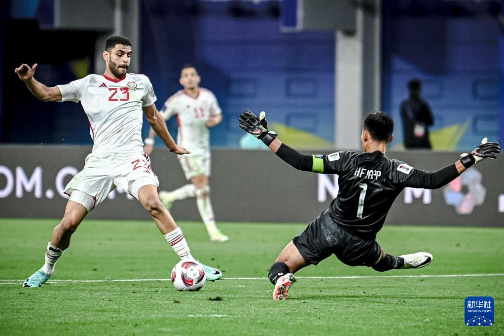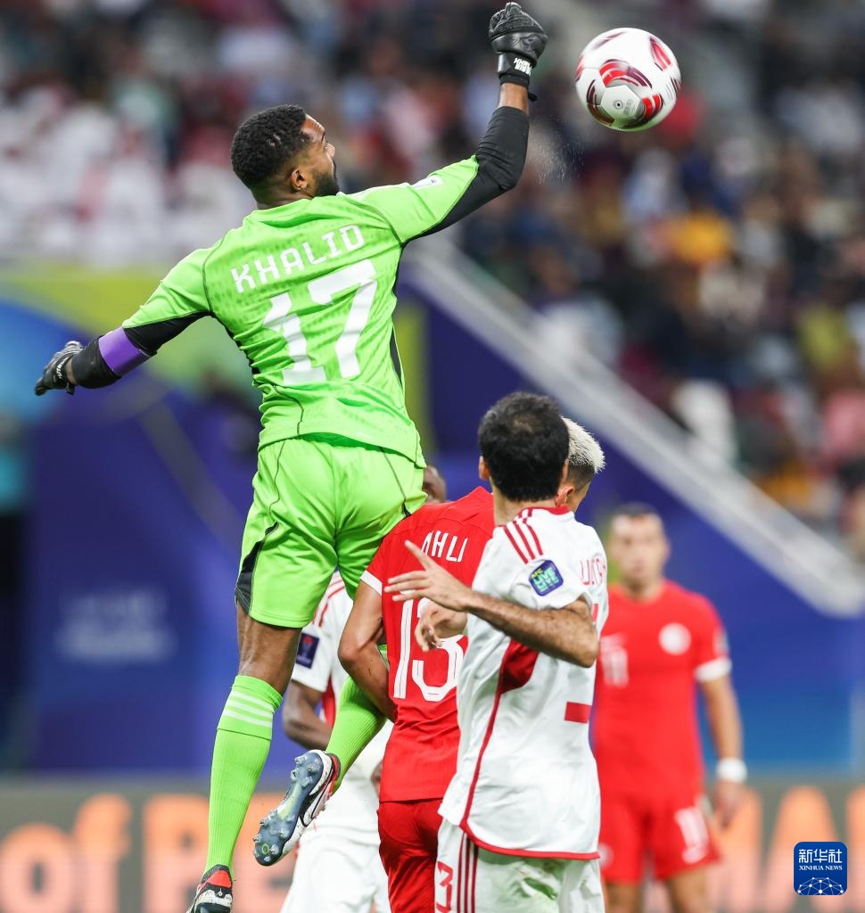 1月14日,阿聯酋隊門將哈立德·伊薩(上)在比賽中撲救。新華社記者 丁汀 攝