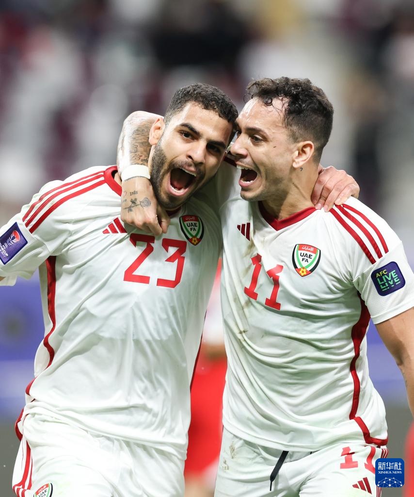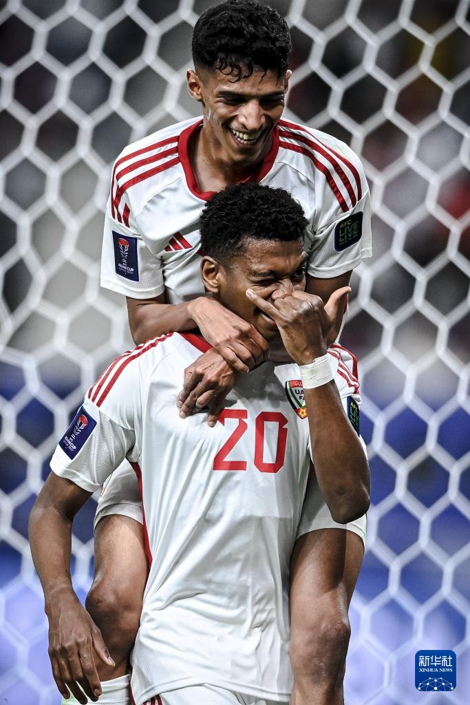1月14日,阿聯酋隊球員葉海亞·阿里·加薩尼(下)在進球后慶祝。新華社記者 江漢 攝