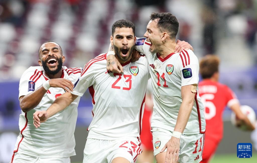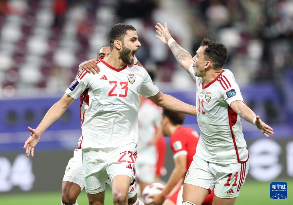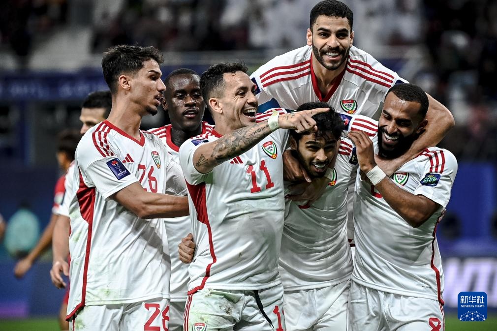 1月14日,阿聯酋隊球員蘇丹·阿德爾(左)與隊友在比賽中慶祝進球。新華社記者 丁汀 攝