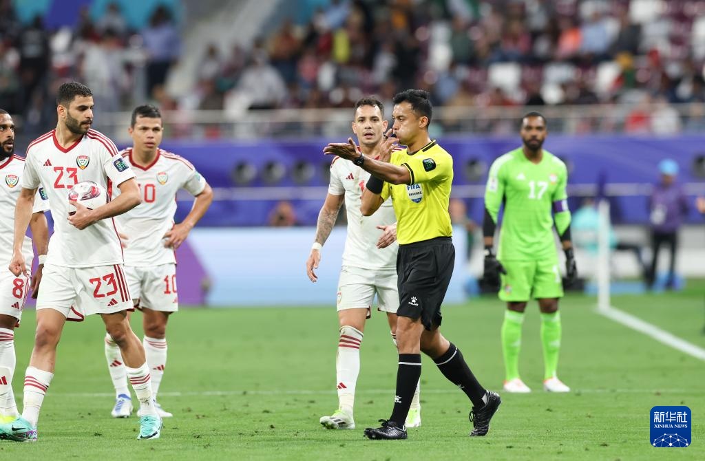 1月14日,主裁判穆罕默德·塔基(右二)判罰阿聯酋隊主罰點球。新華社記者 丁汀 攝