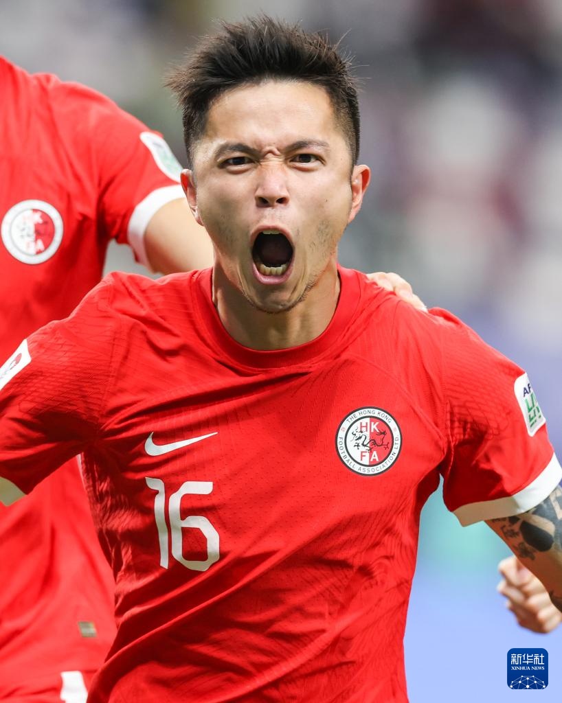 1月14日,中國香港隊球員陳肇鈞在比賽中慶祝進球。新華社記者 丁汀 攝