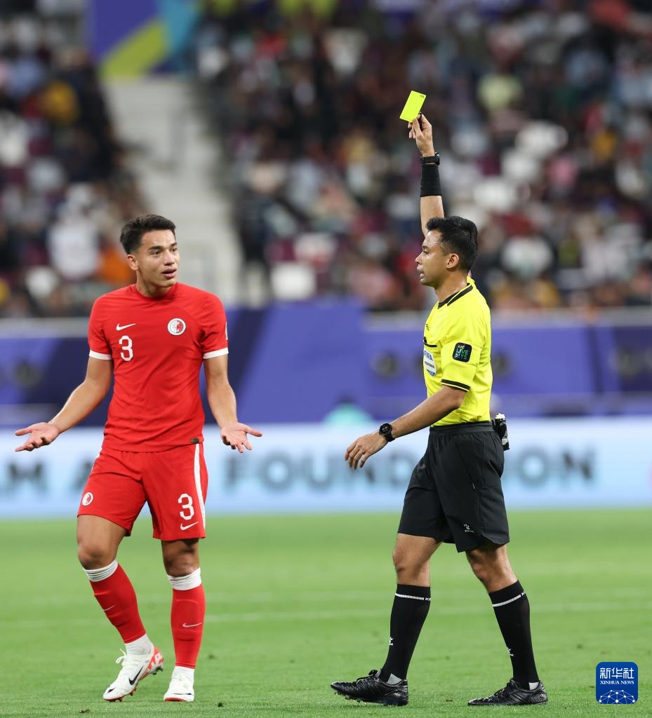 1月14日,主裁判穆罕默德·塔基(右)在比賽中向中國香港隊球員周緣德出示黃牌。新華社記者 丁汀 攝