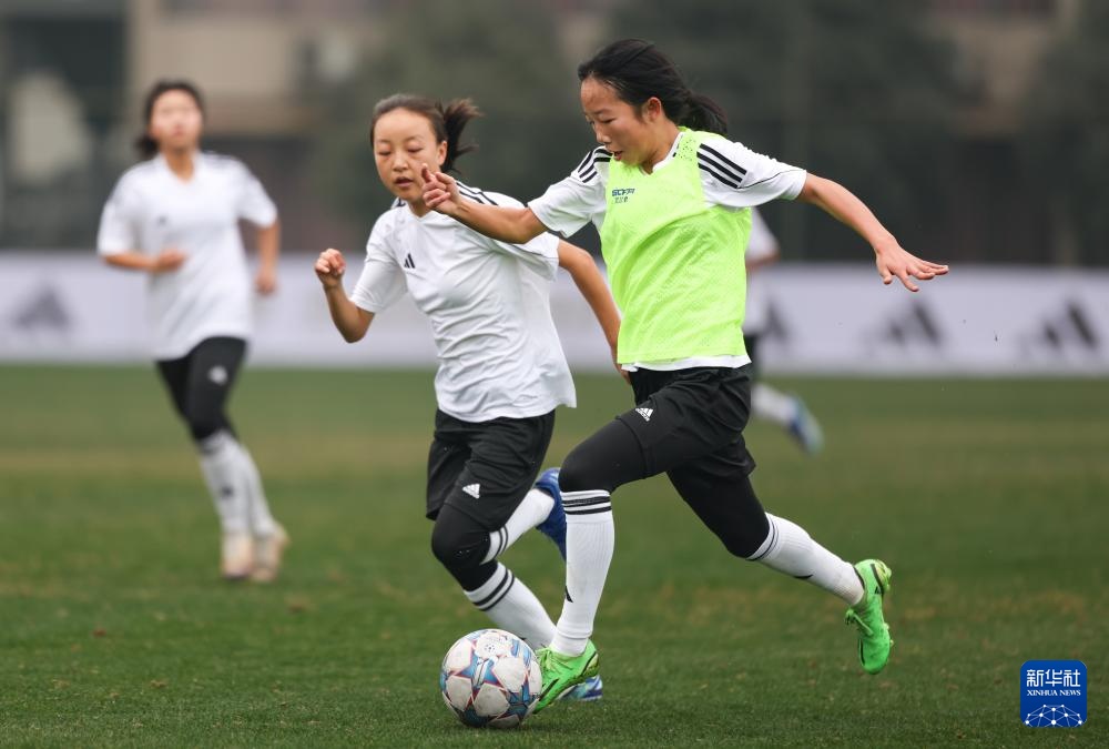 1月15日,四川資中體校U15女足隊員王晨西(右)在成都市溫江足球基地訓練。新華社記者 江宏景 攝