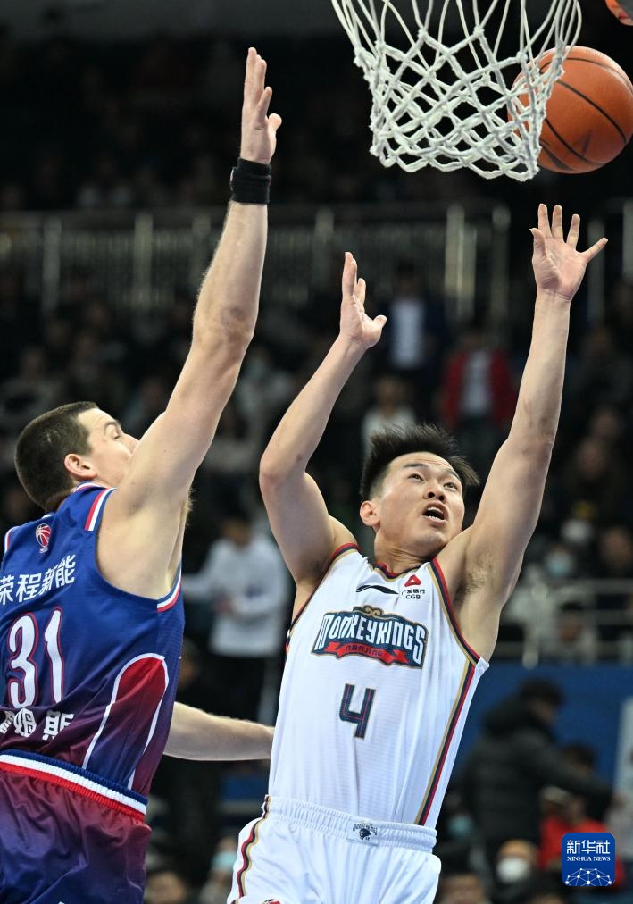 1月15日,南京頭排蘇酒隊球員曾繁日(右)在比賽中上籃。新華社記者 趙子碩 攝