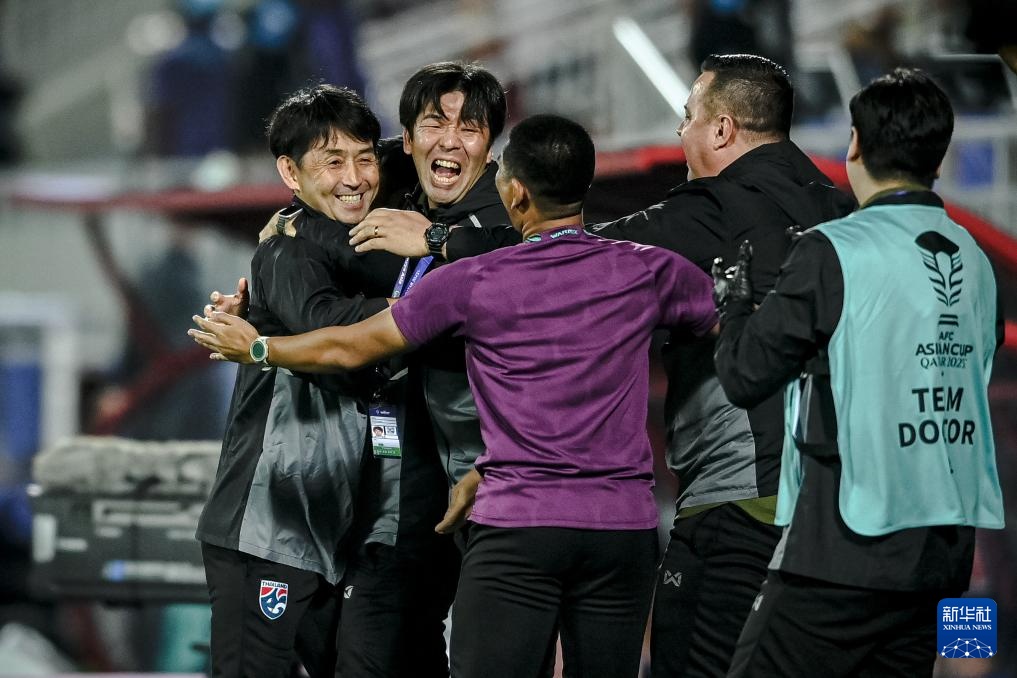 1月16日,泰國隊主教練石井正忠(左一)在球隊進球領先后與教練組成員相擁慶祝。新華社記者 江漢 攝