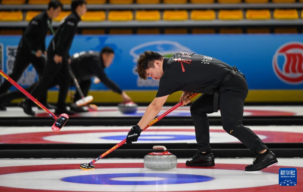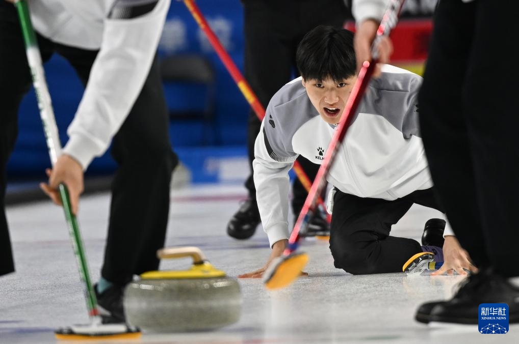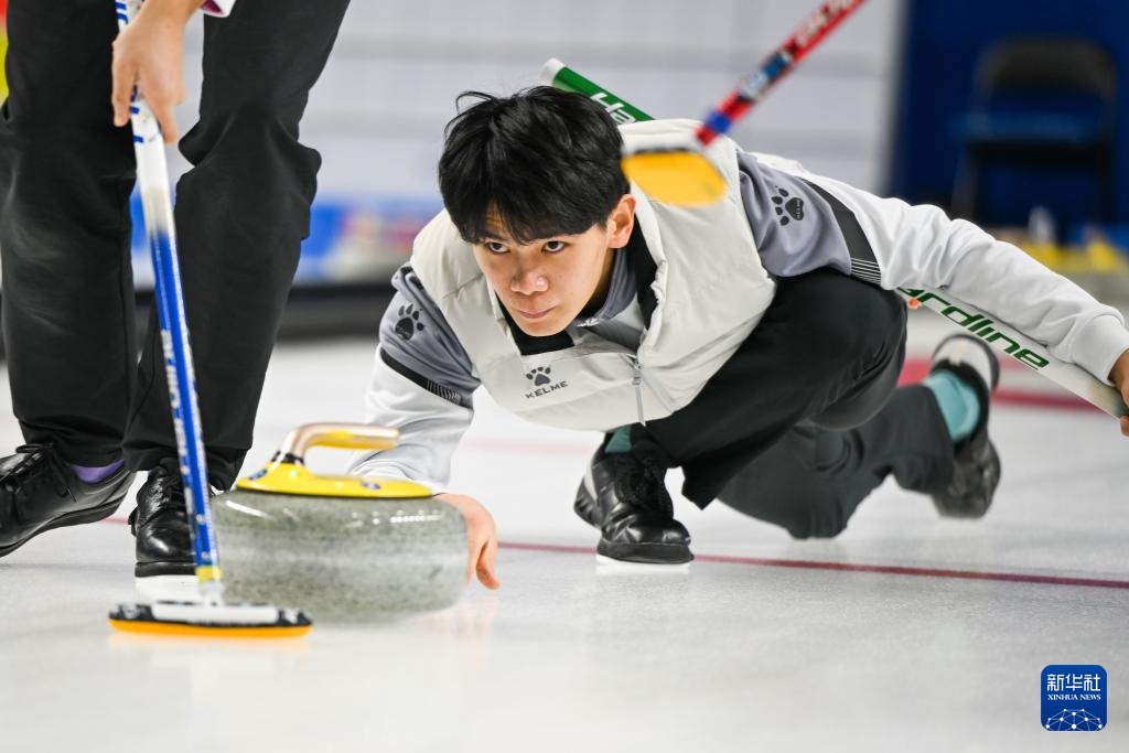 1月17日,青海隊選手祁成在比賽中擲壺。新華社記者 劉磊 攝