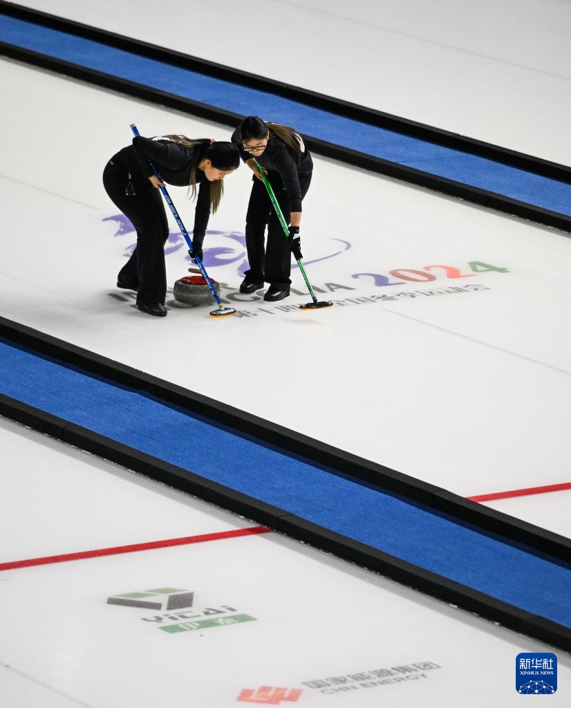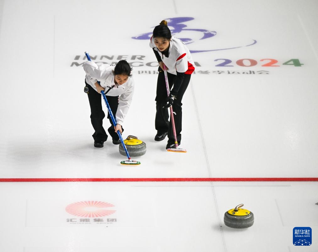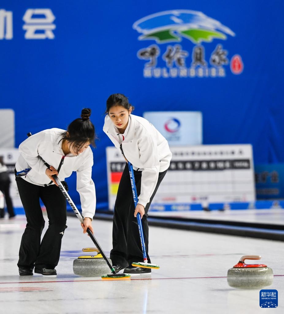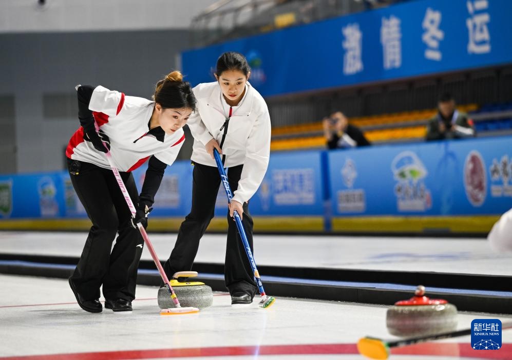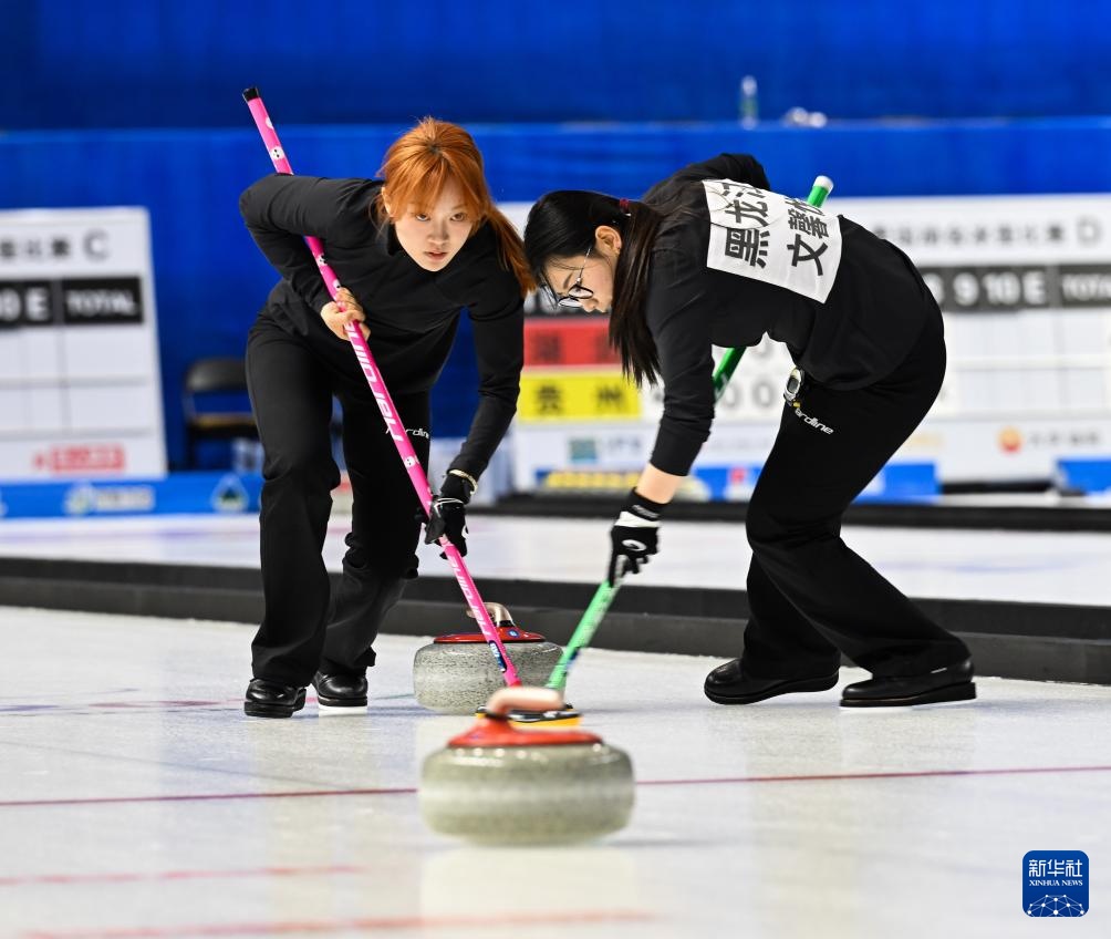 1月17日,黑龍江隊選手孫婧怡(左)和隊友文馨悅在比賽中擦冰。新華社記者 劉磊 攝