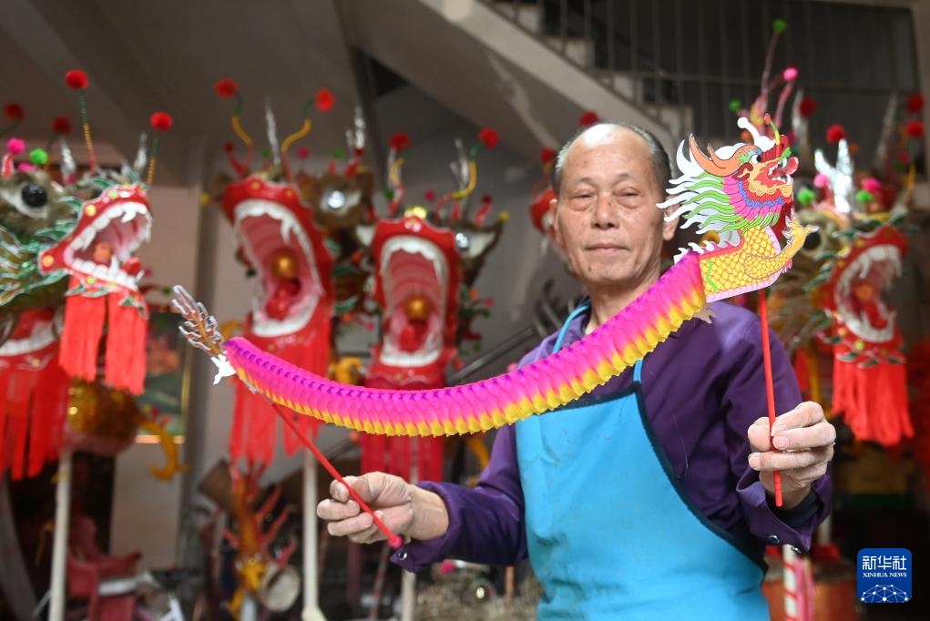 春節臨近,在廣西賓陽縣賓州鎮,手藝人鄒玉特每天都坐在一堆“龍”中間,扎制炮龍。