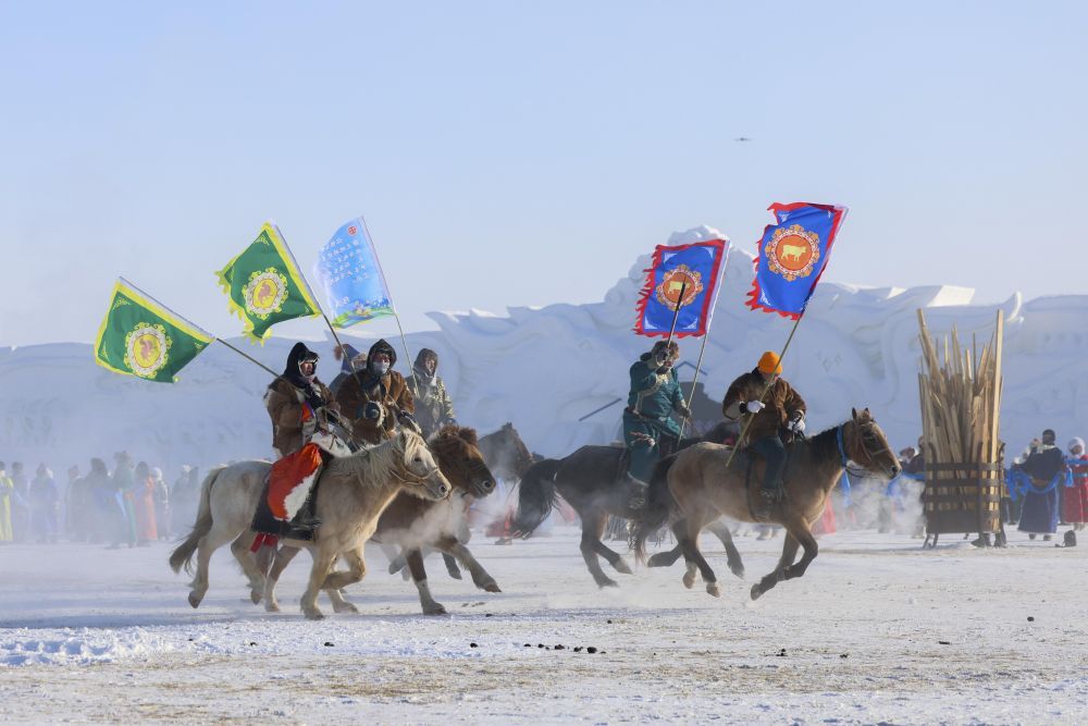 ↑2023年12月7日,賽馬選手在內蒙古自治區第二十屆冰雪那達慕開幕式上入場。新華社記者王楷焱攝