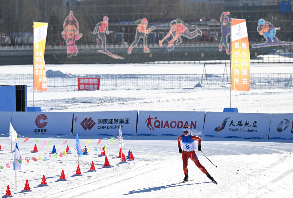 ↑2024年1月14日,在內蒙古呼和浩特市,新疆生產建設兵團隊選手松哈爾·哈斯別克在十四冬群眾越野滑雪女子4X1公里團體接力(自由技術)決賽中。新華社記者 貝赫 攝