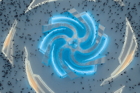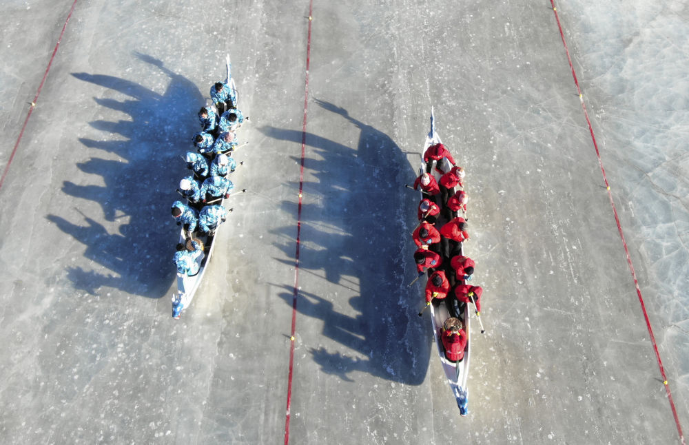 ↑2019年1月25日,在內蒙古自治區多倫縣舉行的十四冬冰上龍舟項目測試賽上,選手在奮力前行(無人機拍攝)。新華社記者鄒予攝