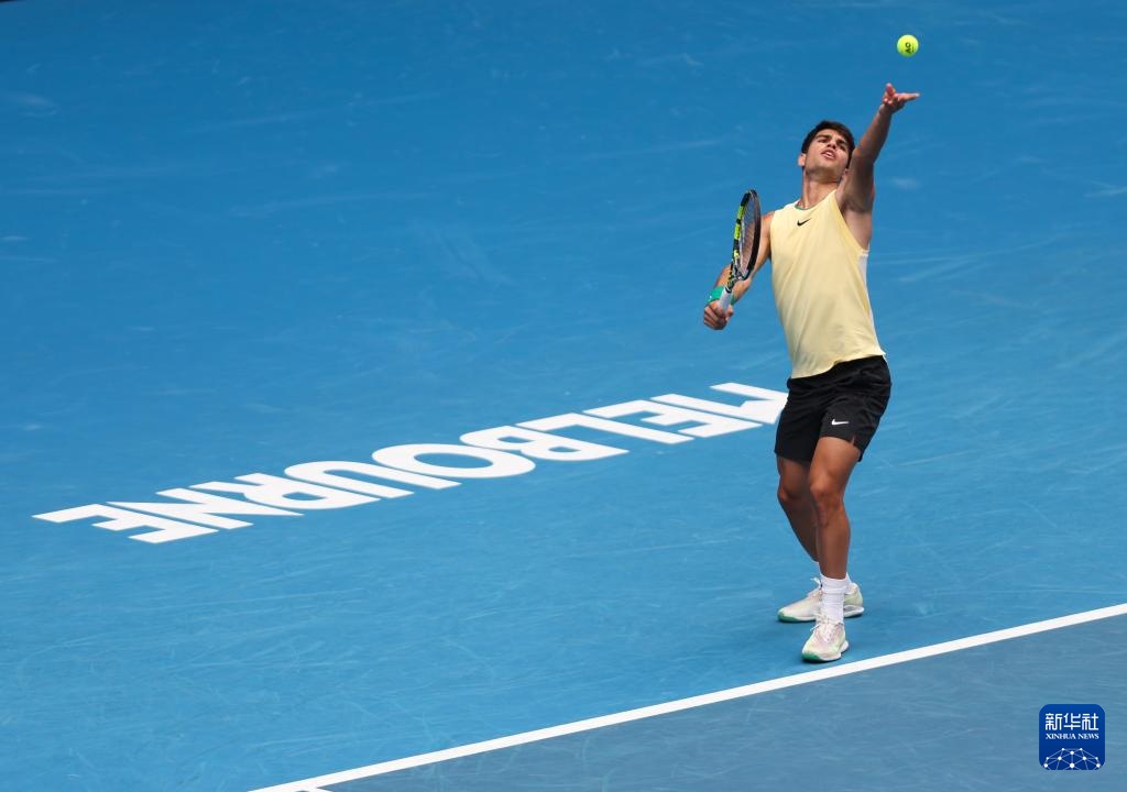 1月18日,阿爾卡拉斯在比賽中發球。新華社記者 馬平 攝