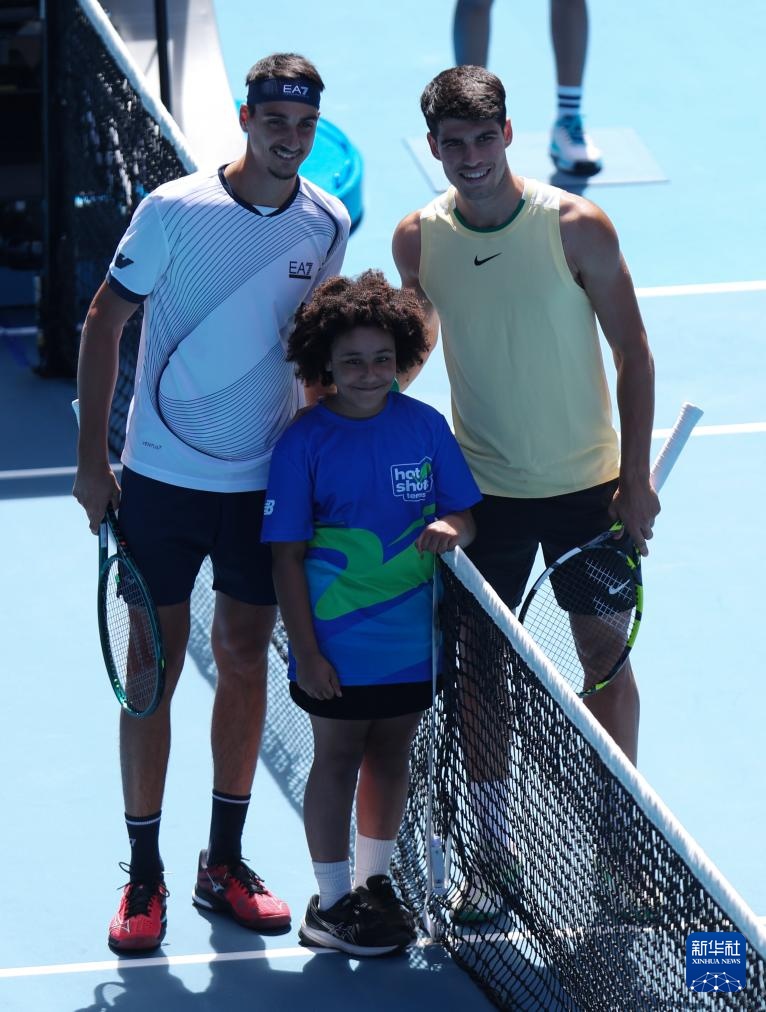 1月18日,阿爾卡拉斯(右)與索內戈賽前合影。新華社記者 馬平 攝