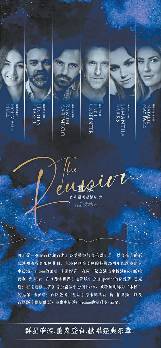 本次音樂會陣容群星璀璨。曾出演“魅影”的萊明·卡萊姆羅,也多次在《悲慘世界》中出演主角;薩曼莎·巴克斯在《悲慘世界》電影版中扮演艾潘妮,也是現役西區《冰雪奇緣》音樂劇中的艾莎女王;厄爾·卡彭特在《悲慘世界》音樂劇版中扮演沙威已超過了2000場;娜塔莉·梅·帕里斯則是西區熱門音樂劇《六皇后》原版卡司,而霍利安·赫爾是現役西區版《劇院魅影》的克里斯汀。除了厄爾·卡彭特外,其他五位演員都是第一次來到中國。