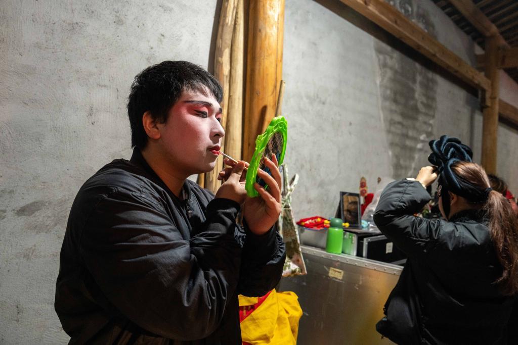 1月15日,在伊塘鎮長木塘村,演員在后臺做演出前的準備工作。