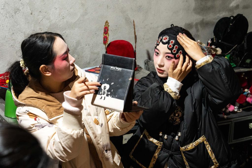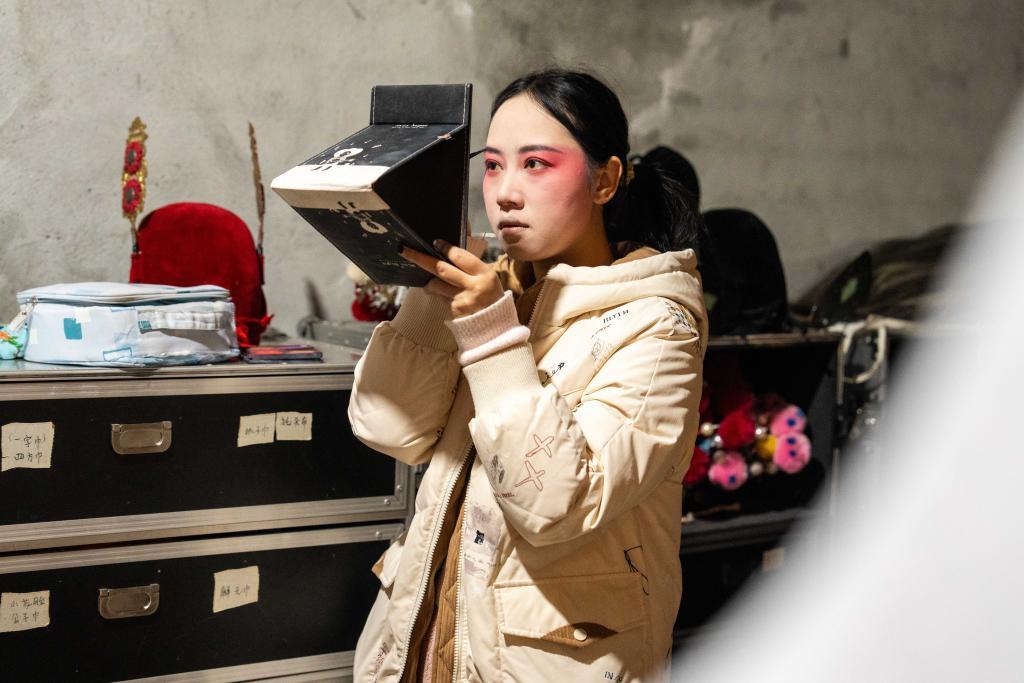 1月15日,在伊塘鎮長木塘村,演員在后臺做演出前的準備工作。新華社記者 陳思汗 攝