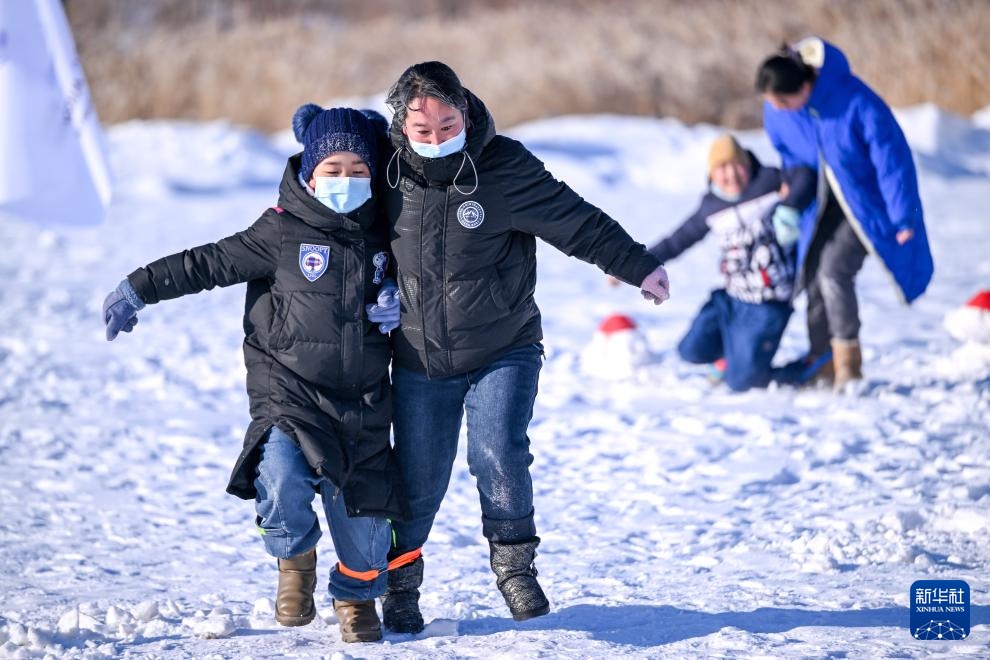 1月19日,一名家長帶著孩子參加雪地兩人三足跑比賽。新華社記者 連振 攝