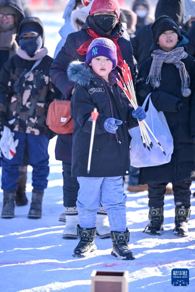 1月19日,一名兒童參加雪地投壺比賽。新華社記者 連振 攝