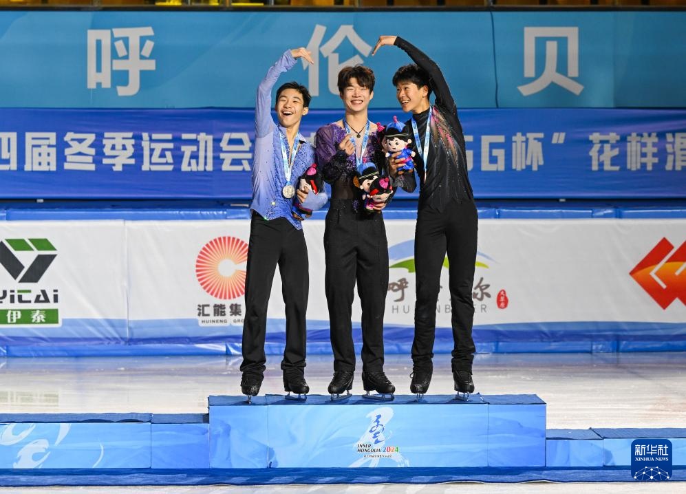 1月19日,冠軍北京隊(duì)選手陳昱東(中)、亞軍吉林隊(duì)選手田桐赫(左)和季軍北京隊(duì)選手趙啟涵在青年組男子單人滑項(xiàng)目頒獎(jiǎng)儀式上合影。新華社記者 劉磊 攝