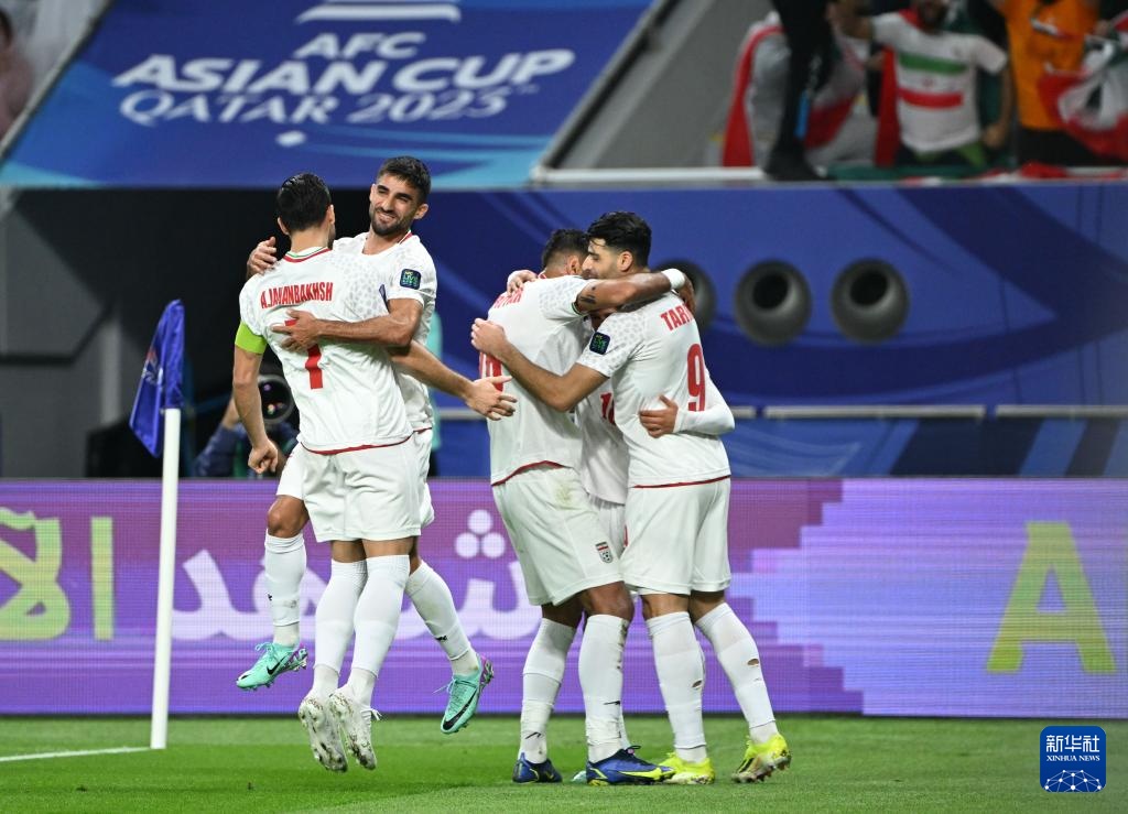 1月19日,伊朗隊(duì)球員在比賽中慶祝進(jìn)球。新華社記者 丁汀 攝