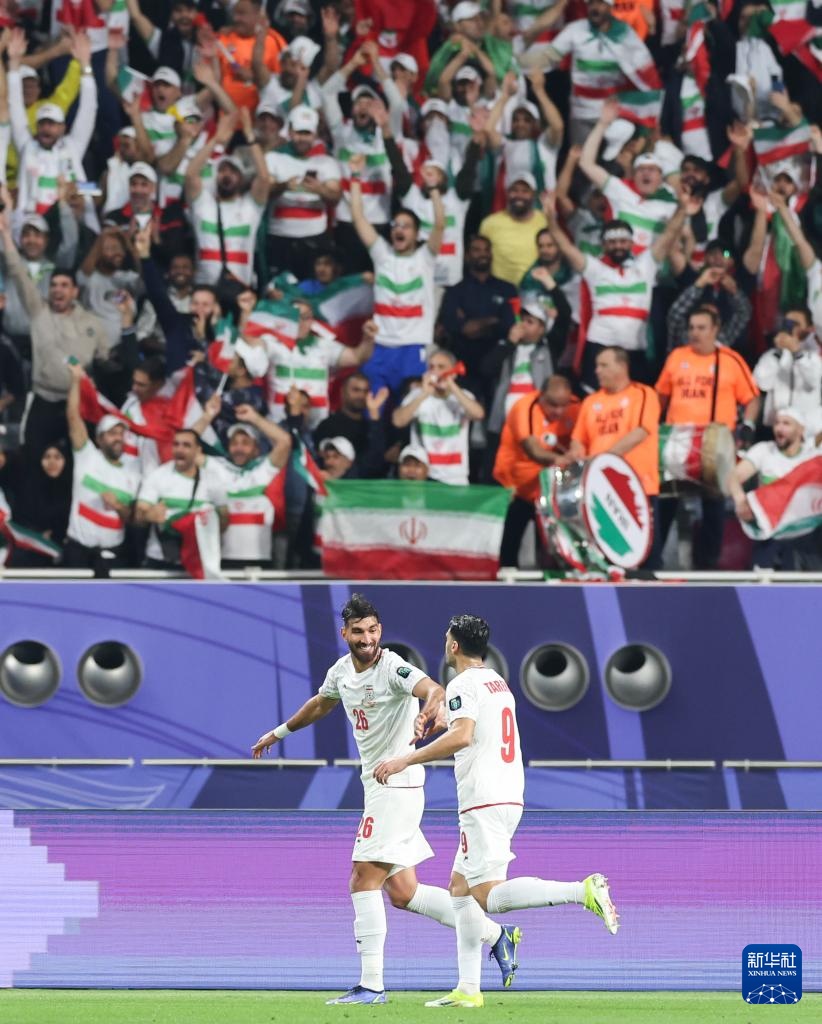 1月19日,伊朗隊(duì)球員莫漢盧(左)與隊(duì)友邁赫迪·塔雷米在比賽中慶祝進(jìn)球。新華社記者 丁汀 攝