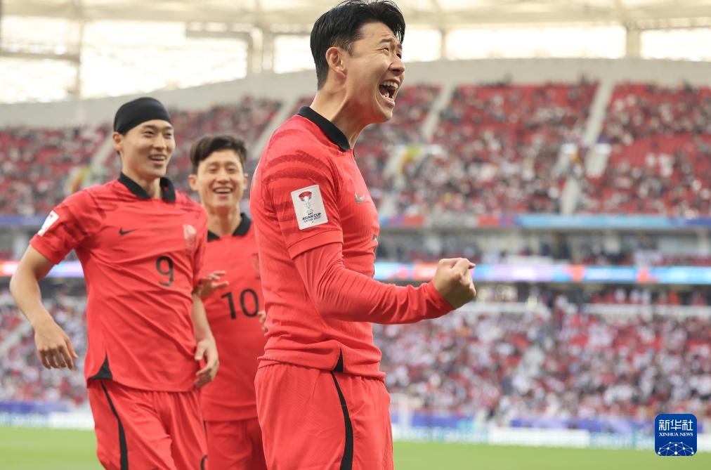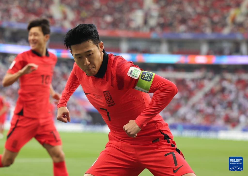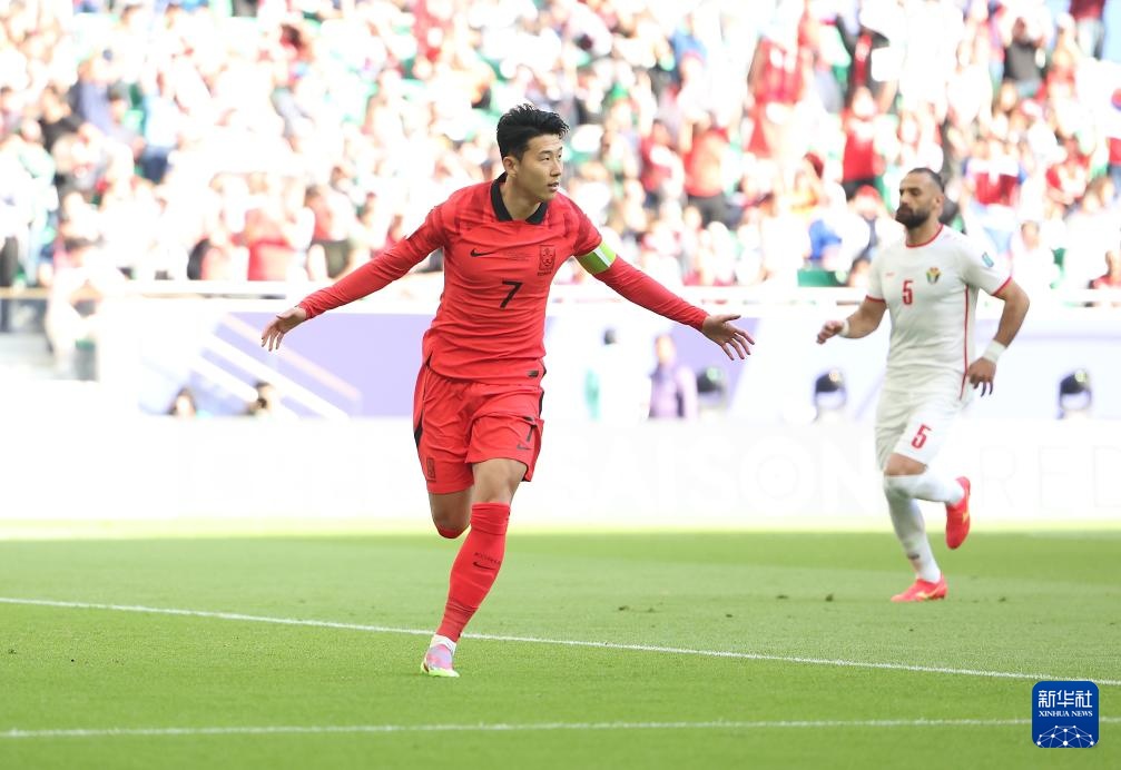1月20日,韓國隊球員孫興慜慶祝打入點球。新華社記者 曹燦 攝