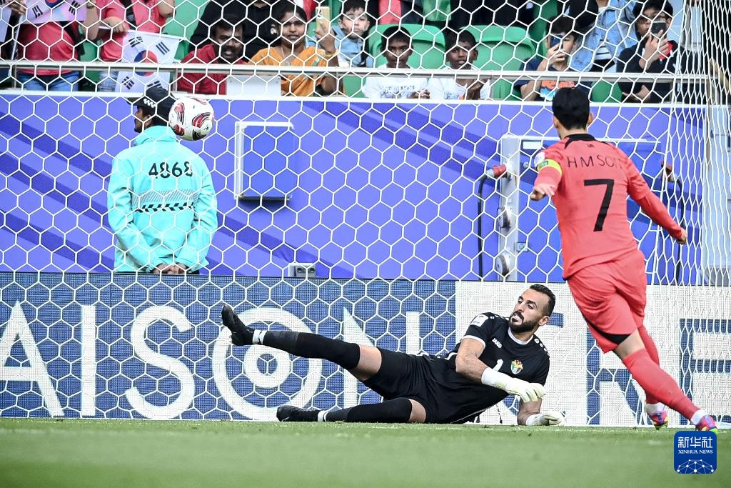 1月20日,約旦隊守門員亞齊德·阿布萊拉(左)在比賽中未能撲出韓國隊球員孫興慜的點球。新華社記者 江漢 攝