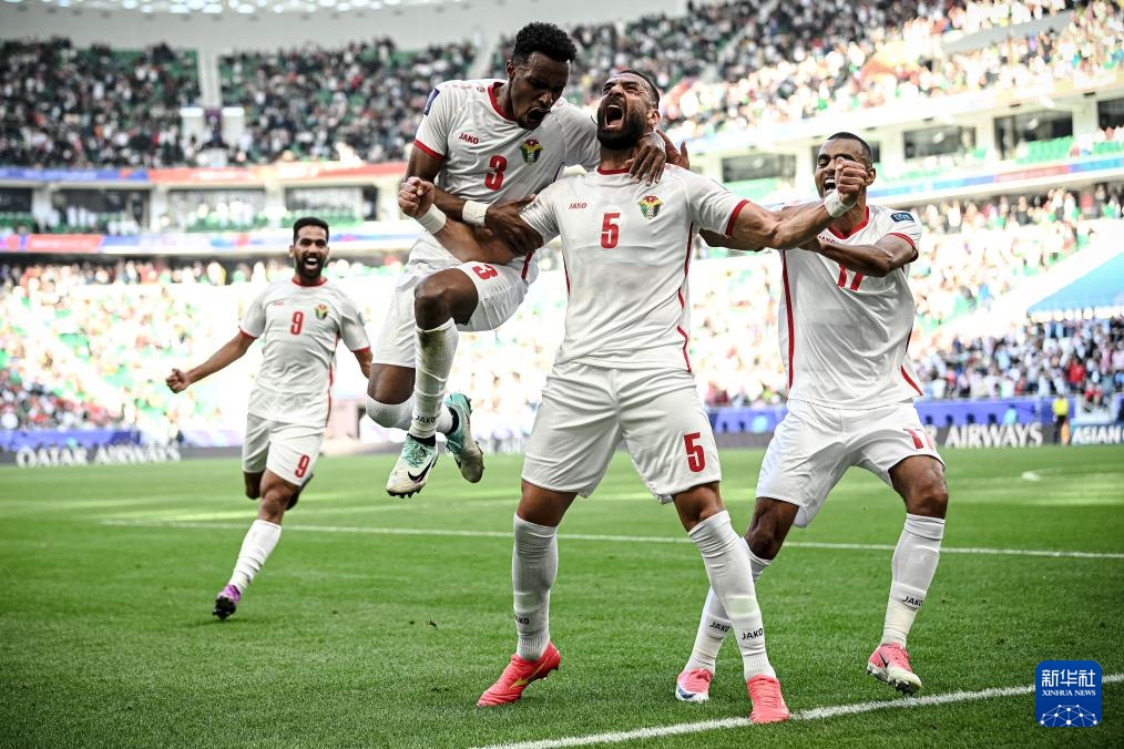 1月20日,約旦隊球員亞贊·阿拉伯(右二)與隊友慶祝韓國隊球員樸镕宇自擺烏龍。新華社記者 江漢 攝