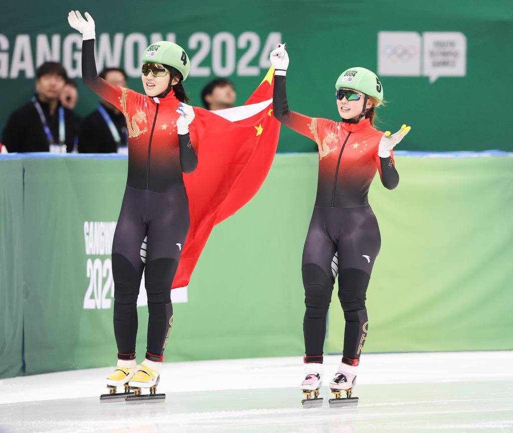 1月20日,中國選手楊婧茹(右)與李金恣在比賽后慶祝。 新華社記者 許雅楠 攝