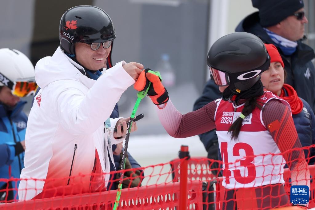 1月21日,張桂園(右前)在比賽后與江原道冬青奧會中國高山滑雪隊領(lǐng)隊肖芳萱慶祝完賽。新華社記者 李明 攝