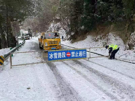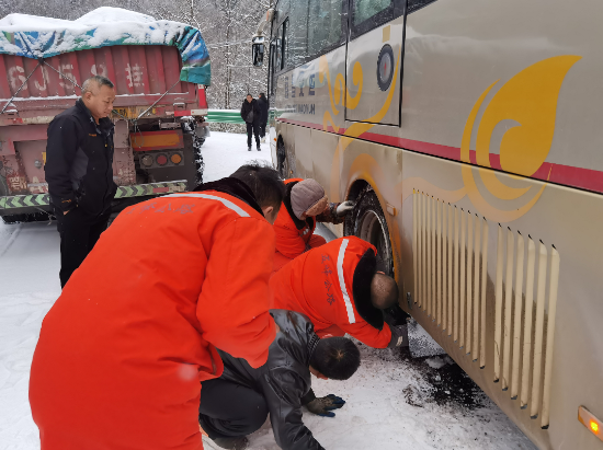 冰雪惡劣天氣行車時交通安全風險較大。請廣大駕駛員朋友注意路面濕滑,戴好防滑鏈,不超員、不超速、不酒駕、以慢為主,特別是在經過橋梁、陰彎等路段,要注意道路結冰。坡陡彎多路段更要小心謹慎、安全駕駛。