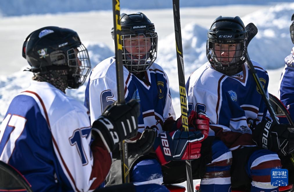 1月22日,蒙古國巴嘎淖爾有限公司冰球俱樂部代表隊球員在場邊交流。新華社記者 貝赫 攝