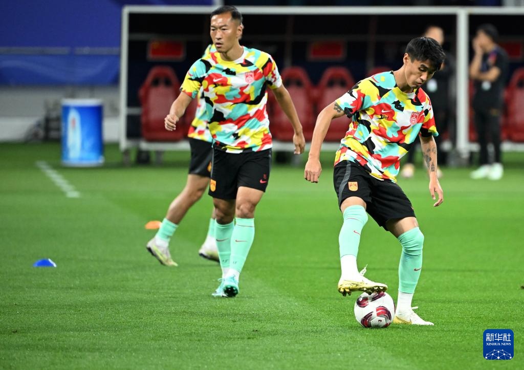 1月22日,中國隊球員林良銘(左)、武磊(中)、戴偉浚在賽前踩場。新華社記者 賈浩成 攝