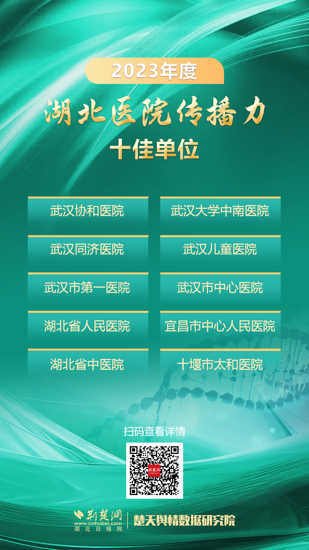1月25日,荊楚網(湖北日報網)、楚天輿情數據研究院發布2023年度湖北醫院傳播力十佳單位榜單,數據顯示,位居前三的醫療單位分別是武漢協和醫院、武漢大學中南醫院和武漢同濟醫院,綜合傳播指數分別為86.02、85.34和85.33。武漢兒童醫院、武漢市第一醫院、武漢市中心醫院、湖北省人民醫院、宜昌市中心人民醫院、湖北省中醫院、十堰市太和醫院躋身年度傳播力指數前十名。此外,湖北省腫瘤醫院、湖北省第三人民醫院、武漢市武昌醫院、武漢市第三醫院、武漢亞洲心臟病醫院等單位入圍年度傳播力指數TOP30榜。