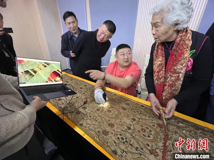 收藏家馮煜(中)用電子顯微鏡向現場專家展示此件波斯錦的織造工藝。記者 潘旭臨 攝