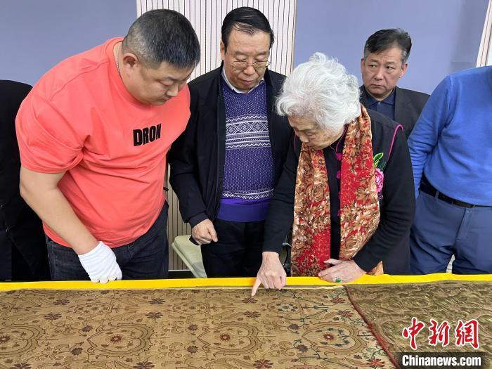 收藏家馮煜(左)與張淑芬(右二)等專家在現場觀看此件波斯錦。記者 潘旭臨 攝