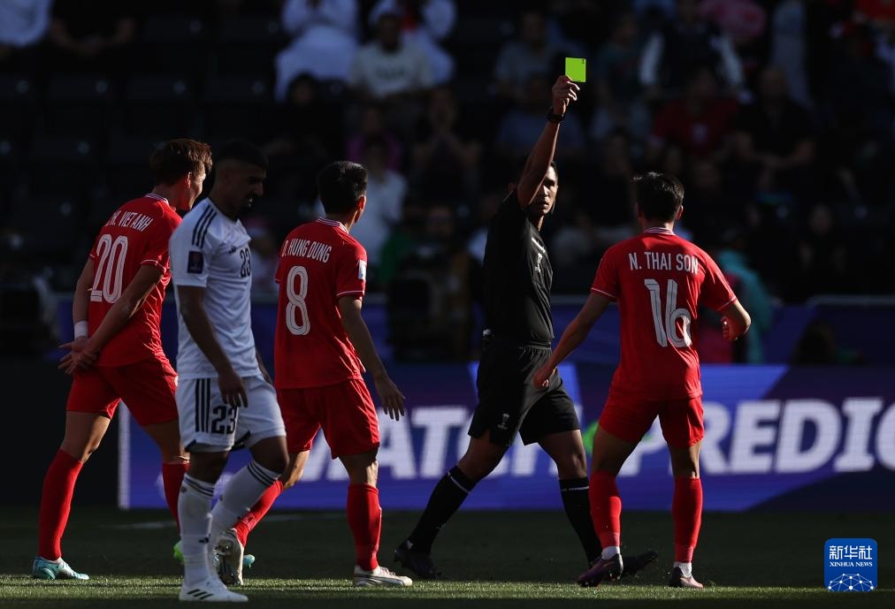 1月24日,主裁判在比賽中向越南隊球員阮泰山(右一)出示黃牌。新華社記者 賈浩成 攝