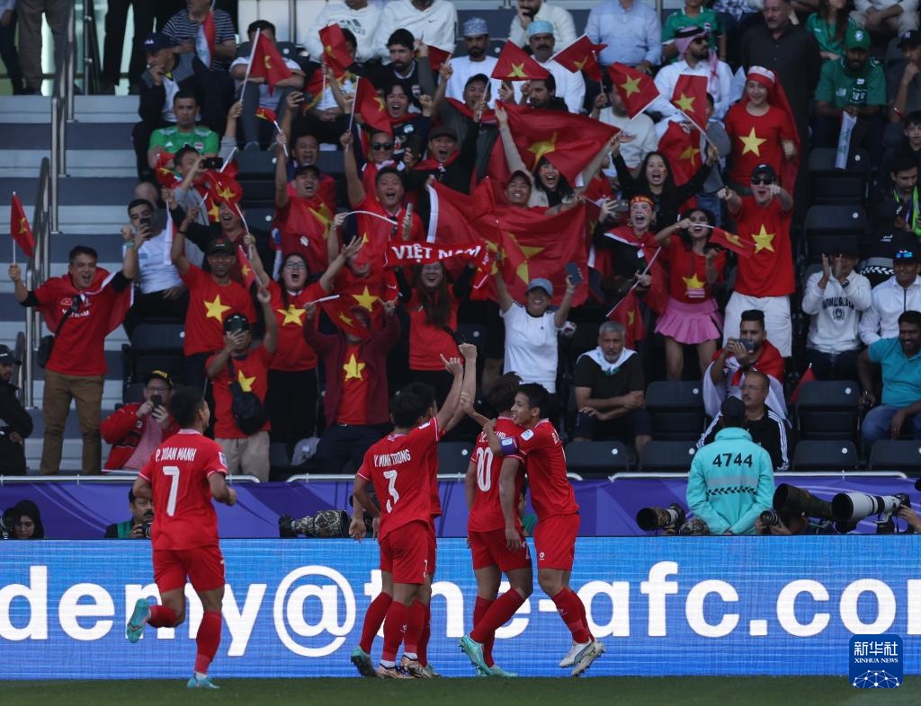 1月24日,越南隊球員裴黃越英(前右二)在比賽中進球后慶祝。新華社記者 賈浩成 攝