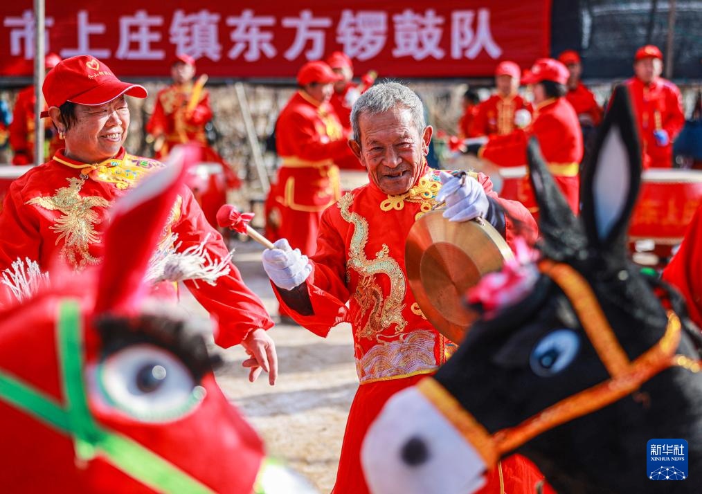 1月24日,在山東省榮成市上莊鎮大集,民間藝人在進行漁家鑼鼓、漁家秧歌表演。