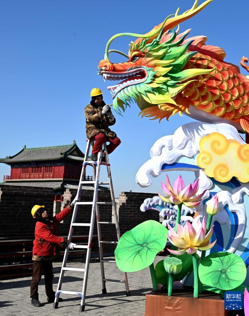 1月24日,工人在河北省石家莊市正定古城南城門安裝花燈。