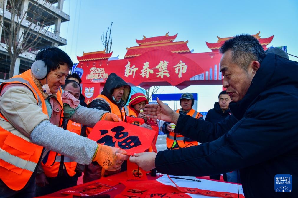 1月24日,在濟南市醫療康養綜合服務基地建設現場,濟南市歷城區美術館志愿者為中建三局施工人員書寫福字。