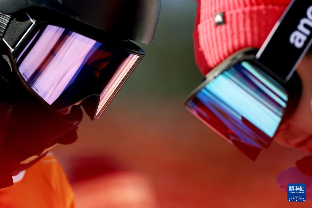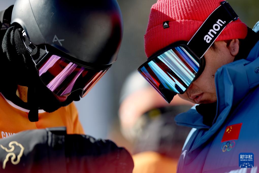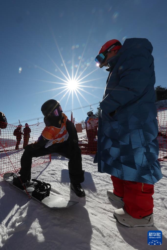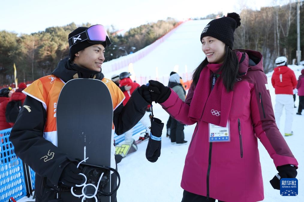 1月25日,葛春宇(左)在等待區(qū)與教練趙俊博交流。新華社記者 李明 攝