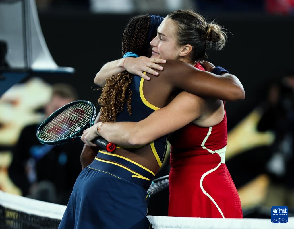 1月25日,薩巴倫卡(右)與高芙賽后擁抱。新華社記者 馬平 攝